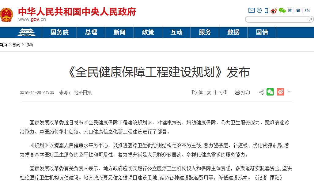 国家发展改革委近日发布《全民健康保障工程建设规划》(以下简称《规划》),对全面健康保障工作进行了部署。根据《规划》内容,自2017年起,将不再安排中央预算内投资支持乡镇卫生院和村卫生室项目建设,相关建设资金由地方政府负责筹集。