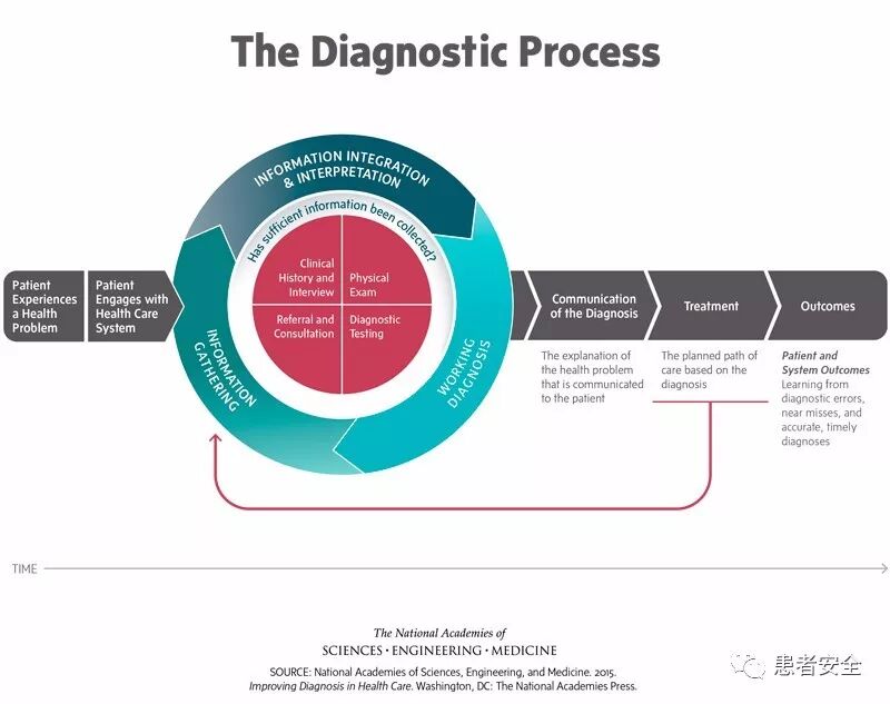 正确诊断在医疗保健中至关重要,它是对患者健康问题做出解释,并告知患者随后将要进行治疗照护方案。数十年来,诊断错误即不准确诊断或延误诊断,在提供高质量的医疗照护中它都是一个盲点。在所有的医疗机构中都存在诊断错误问题。诊断错误并将继续对难以估量的患者造成伤害。 对诊断过程的改进不仅是可行的,而且是道德、专业和公共卫生的迫切需求。美国国家科学院、工程院和医学院,在多方支持下,召开了一个专家委员会对诊断错误进行综合分析,并提出准确诊断的一些建议。 IOM:To Err Is Human: Building A Safer Health System (2000) IOM:Crossing the Quality Chasm: A New Health System for the 21st Century (2001) 2015年,美国医学研究所(IOM)发布了《提高医疗诊断水平》( Improving Diagnosis in Health Care),这是继《人非圣贤孰能无过:建立一个更安全的卫生系统(2000)》和《跨越质量鸿沟:21世纪的新卫生体系(2001)》两份里程碑式报告之后的又一报告,主要是发现诊断尤其是诊断错误,在众多医疗机构在改善医疗质量和安全方面的工作中没有得到重视。委员会认为,这种忽视诊断错误的现象带来的后果是显而易见的,大多数人一生中至少会经历一次诊断错误,有时这种错误会带来灾难性的后果,所以非常有必要对诊断错误倍加重视,进行紧急变革来应对这一挑战。 【什么是诊断错误?】 该专家委员会定义的诊断错误是“未能对患者的健康问题做出准确而及时的解释,或未能将该解释告知患者。”因为患者是诊断错误的最终承受着,所以这个定义是从患者的角度出发来构建的。这个定义还反映了诊断过程的迭代性和复杂性,以及需要进行表达更多信息,而不仅仅是一个疾病标签。 诊断错误原因众多,包括临床医生、患者及其家属间的合作和沟通不足;临床支持系统无法对诊断过程提供充分的支持;对临床医生诊断正确与否缺乏反馈;缺乏透明度和披露的文化氛围会阻碍正确的诊断,反过来也阻碍从这些事件中学习和改进诊断。 诊断错误可能导致中止或延误适当的治疗,转而提供不必要的或有害的治疗,或造成心理或财务负担,进而对患者造成伤害。据估计,在美国,每年约有5%的成年门诊患者经历过一次诊断错误。在对几十年的尸检研究中也发现诊断错误导致大约10%的患者死亡,从病历档案记录的研究也表明在医院不良事件中诊断错误占6~ 17%。此外,诊断错误是医疗事故索赔的主要原因,与其他索赔相比,导致患者死亡的可能性几乎是前者的两倍。 该专家委员会认识到,只从单方面专注于减少诊断错误是无法达到全面降低诊断错误的,反之。有必要从多方面关注来加以流程改造,提高诊断率。为了更好地理解诊断流程,委员会开发了一个概念模型来阐明诊断过程(见下图),描述影响这个过程的工作系统因素,寻求改进诊断过程的机会。 【改进的目标】