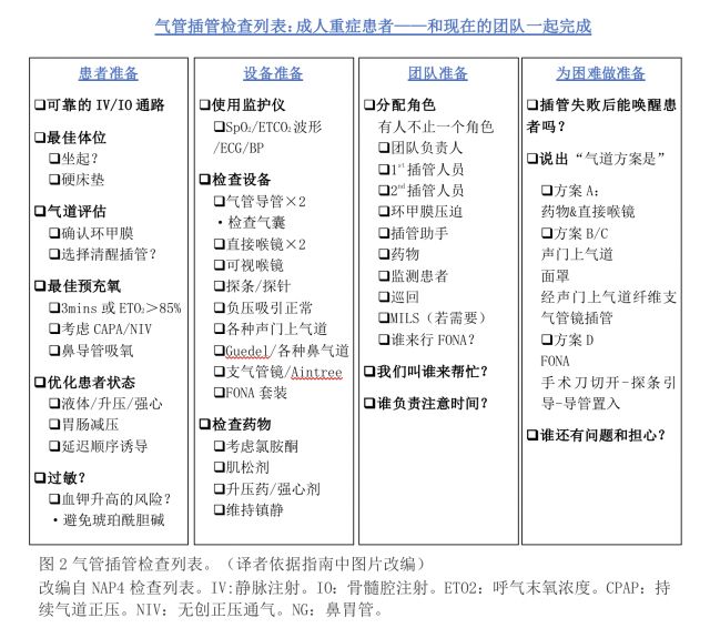 成人重症患者气管插管管理指南(附中英版下载)成人重症患者气管插管管理指南 翻译:秦皇岛市北戴河医院 郭志强 摘要 本指南针对医院各科的重症患者如何优化氧合、气道管理和气管插管进行全面阐述。这也是对第4届麻醉与困难气道学会皇家学院全国审计的回应,审计特别指出对极易发生严重并发症的患者以及可以避免的死亡在管理方面存在缺陷。指南以可靠的证据为基础,辅以专家建议弥补证据不足。指南指出改善急诊气道管理的预后需要密切关注人为因素,而非简单的引入新设备或技术精进。气道管理整个过程中强调气道团队作用、共享思维模式、制定计划、以及沟通。强调氧合第一(包括预充氧和保障氧合)。建议采用改良快速顺序诱导方式。提倡方案B和方案C联合的优化管理流程,整合了Vortex方法中的内容。强调,为了避免延迟和彻底失败,最重要的是限制操作尝试次数,果断承认失败,并进入流程的下一环节。指南推荐尽早使用有屏幕的可视喉镜,在气道挽救时使用第二代声门上气道装置。推荐紧急打开颈前气道采用“手术刀切开-探条引导-导管置入”技术,同时也认可训练有素的专家实施的其他技术的价值。由于大多数危重的气道灾难发生在拔管后,原因为脱管或堵管,对避免此类并发症的根本方法也加以强调。 前言 未预料的困难气道管理指南的发布及2015年更新改变了麻醉科的困难气道管理。但是,皇家麻醉医师学院和困难气道学会第四次全国审查项目组(NAP4)强调指出,ICU和急诊气道管理导致的不良后果和存在的重大缺陷高于麻醉科。 不同患者(成人、儿科、肥胖、急诊、院前及拔管)所面临的问题都已经有专门指南阐述。尽管医院各个病房(急诊、ICU、普通病房)都会有重症患者,挑战别具一格(表1),且并发症的风险最高,然而用于管理这类患者的专业指南只有印度发不过一个,其它就没了。 对于危重病,患者因素可能妨碍标准气道评估。急迫性和生理储备降低导致围插管期明显缺氧、低血压、心律失常、心跳骤停,以及死亡的风险显著增加。气管插管过程中,延误和喉镜反复尝试会增加并发症,也包括心跳骤停和死亡。ICU插管高达30%不能“一次成功”,明显高于手术室。ICU插管过程中严重缺氧(SpO2<80%)的患者高达25%。此外,大约4%的ICU患者入住是为了观察气道、气管插管、原本就有气道问题来拔管,并且总体上大约6%的ICU患者是预期困难气道。危重病本身和其治疗能使得解剖“正常”的气道成为“生理性困难气道”。液体复苏,毛细血管渗漏综合征,俯卧位通气和长期气管插管都能够导致气道水肿和畸形。常常不适宜清醒插管,而且气道管理失败后唤醒患者通常不切实际。其他突出问题包括环境、操作者或参与者的经验,和其他人为因素(表1)。ICU发生严重气道事件时,死亡率和脑损伤的发生率比手术麻醉高约60倍。 尽管ICU气管插管本身风险就高,但大多数气道事故发生在安全建立人工气道之后,原因是气道脱管或堵管;在一组患者中,82%的事故发生在插管后,有25%患者死亡。病情3级入ICU的患者有10-19%行气管切开,气道事故的风险特别高。 在英国、困难气道学会(DAS),危重病医学会(ICS),危重病医学协会(FICM)和英国皇家麻醉学会(RCoA)意识到需要特定指南为成人危重症患者气道管理提供结构化方法。解剖或生理因素可能造成气道管理困难,对ICU、急诊和病房的患者造成严重影响。本指南适用于所有这些危重症患者,无论医院位置。和其他临床情况的气道指南一样,为了预防并发症,氧合第一同时要努力限制气道操作次数。针对解决危重症的特定问题,本指南讨论了多学科团队组建和环境准备、改良气道评估、气管插管时的预充氧和氧供(称做“保证氧合”)、血流动力学管理、快速顺序诱导的作用,最佳喉镜(含可视喉镜)、一体化的B方案和C方案,颈前气道(FONA)的紧急选择、以及一些特殊情况。本指南未涉及插管指征。 方法 2014年DAS委派了一个工作组,代表了DAS、ICS、FICM和RCoA。先检索Medline、PubMed、Embase、Ovid和Google Scholar数据库,时间从2000年1月到2014年9月。通过主题词和过滤条件对已发表的英文文章和摘要进行检索。检索词见补充材料1。定期重复检索直到2017年5月,共检索33020篇摘要,工作组筛选出1652篇全文。还有一些文章通过交叉引用和手工检索获得。非预期困难气道不可能进行对照研究,特别是危重症。证据质量差异极大(GRADE分级从2+到5),没有证据支持则采用共识。 DAS2015版指南中无需变更的内容,特别是在“插管失败氧合失败”(CICO)情况下经环甲膜行颈前气道(FONA)的实用技术,本指南予以重复。若其他额外的专业知识和决断认为有用,(可视喉镜、烧伤和气管插管期间的心血管崩溃)将被审查并形成共识。在工作过程中征求重症社区和DAS成员的意见,并在2015年至2017年间在各国专业会议上提出讨论。在DAS网站论坛上可以进行评论和提问。与以往的DAS指南一样,草案分发给相关专业组织审阅,邀请英国和国际专家做出评论。工作组审阅所有回应后最终形成指南。 免责声明 指南的内容并非临床实践最低标准,也不能代替临床正确决策。是组织和个人用于准备、培训、制定临床实践的框架。本指南针对的是受过一定训练的操作人员。 人为因素 人为因素包括环境影响、团队行为和个人能力。人为因素是医疗差错最常见的原因,并且在皇家麻